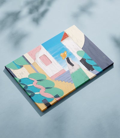 天気のいいある日、お昼頃の町を描いています。鮮やかな色彩と柔らかな光の表現により、温かみと平穏が感じられます。木々の緑と建物の調和が美しく、自然と人工物が共存する活気あふれる景色が広がります。