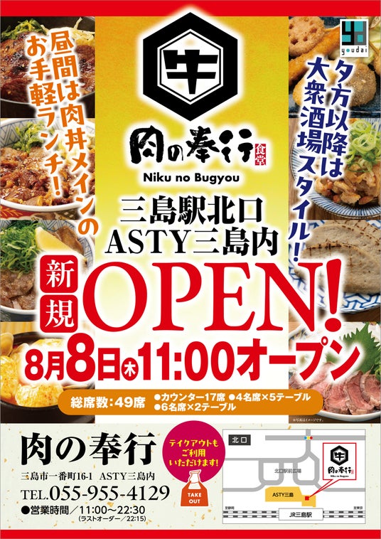 静岡県東部にて飲食店を営む雄大株式会社(本社:静岡県沼津市・代表取締役社長:土屋大雅)が、「肉の奉行」を静岡県三島市に初出店することを発表。2024年8月8日(木)OPEN。