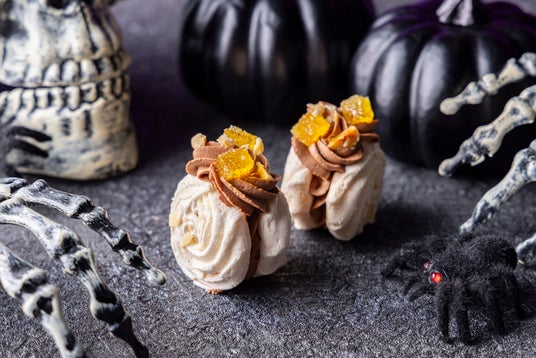 まるで包帯をぐるぐると巻きつけたような「チョコレートとヘーゼルナッツのムラングシャンティー」は、さくさくのメレンゲに、たっぷりのショコラ、そしてヘーゼルナッツとベルガモットジュレをトッピングしたこだわりのスイーツです。「黒胡麻プリン」は、墓場をイメージした見た目とは裏腹に、健康的な黒胡麻をふんだんに使用したなめらかなプリン。カルダモンがほんのりと香るソースと、ざくざくの真っ黒なクランブルが絶妙に調和しています。そのビジュアルと味わいが、ハロウィンの楽しさを一層引き立てます。