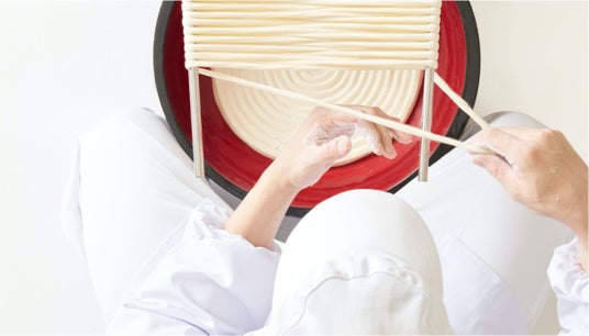 生地の原材料は、稲庭の栗駒山系から湧き出る名水、国内製造の小麦粉、海水塩。そして、稲庭の空気、風、時間。職人が手で練り、五度熟成させます。手をかけ、時間をかけ、心で仕上げる。