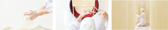 寒い時期限定でつくる「稲庭そうめん」は、(中略)小麦本来の豊かな風味を楽しめます。国内産の小麦粉を5段階に分けて熟成させることでできた気泡が、調理スピードも早め、モチモチとしたコシの強い歯応えを生み出します。茹で上がりの麺のツヤがよく、つるりと滑らかなのどごしと透明感があるのが特徴です!