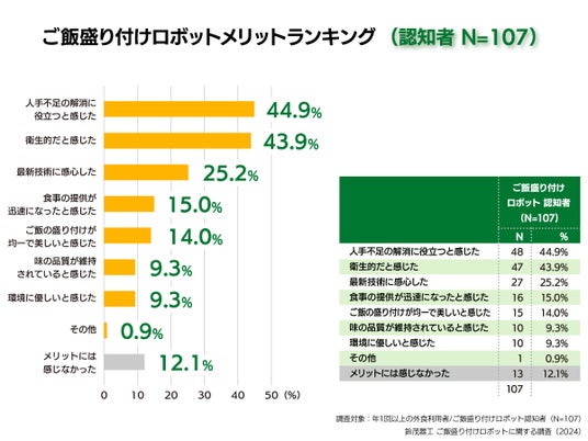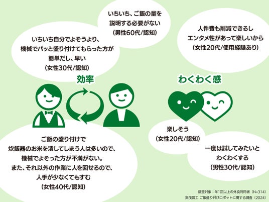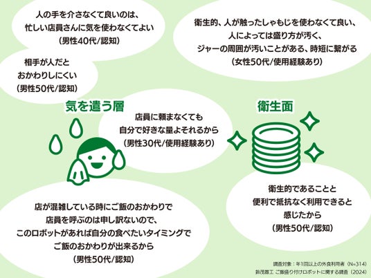 ご飯盛り付けロボットの認知者にとっては「人手不足の解消に役立つ」「衛生的」は2大メリット。外食利用の際に、「自分の食べたい分だけ適量食べられる」「温かいご飯が食べられる」ことはどの層にとっても魅力に感じられている。「しゃもじを使わないこと」や「誰でも簡単に使える」点を評価する層もあり、今後の普及もますます期待される結果となった。