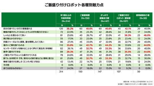 年1回以上の外食利用者の7割以上がご飯盛り付けロボットについて魅力を感じており、各層において共通して評価されている点としては、「自分の食べたい分だけ適量盛れること」を重視している点があげられる。これは、外食の際のご飯のがっかり経験を聞く設問において、“ご飯の食感(固い・べちゃっと・乾いて・冷えて)に関すること”が上位を占め、2位には量に関する項目(食べたい量よりも多い・少ない)がランクインしていた点と連動している結果と言える。