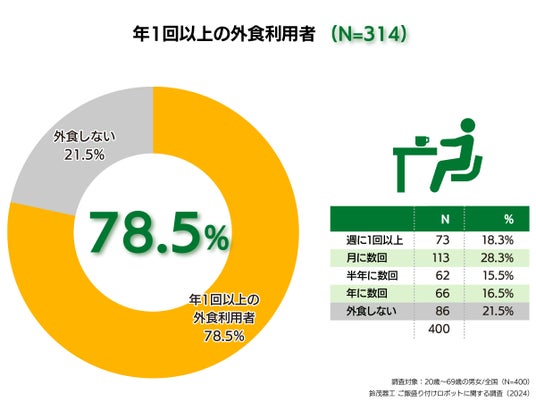 全国の20~69歳の男女400名にWEBアンケートを実施したところ年1回以上の外食利用者は78.5%(N=314)となった。