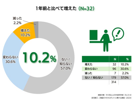 その影響も少なからずあり、ご飯盛り付けロボットの見聞きする頻度を1年前と比べてどの程度変化しているかを聞いた設問では、10.2%の人が1年前と比べて増えたと回答している。