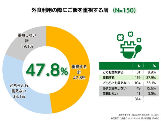 年1回以上の外食利用者(N=314)を基本として、外食頻度・外食利用の際にご飯を重視する層(N=150)・外食で提供されるご飯のがっかり経験あり(N=147)・ご飯盛り付けロボット認知/使用経験などの軸で傾向をまとめていく。