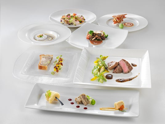 ご夕食は、ファンダイニング「コッコラーレ」スペシャリテ、または日本料理「あわみ」の4周年記念コース料理からお選びいただけます。コッコラーレ「スペシャリテ」でご提供するコースの前菜は、淡路島えびす鯛、兵庫県但馬産赤海老、鮑などの魚介に、トマト、ビーツ、バジルとバターナッツ南瓜の4種類のソースを添えた「海の幸のカルパッチョ」と「パテ・アン・クルート」の二皿。