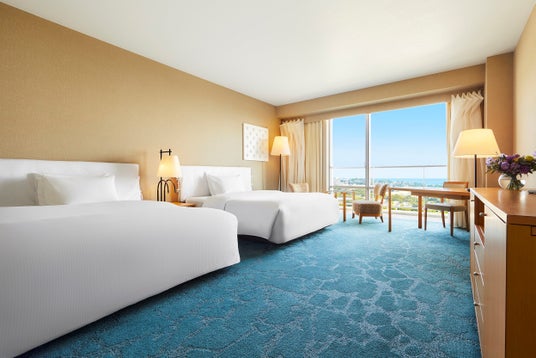ホテル開業4周年を記念した当プランでは、通常デラックスルームの料金からワンランク上のラグジュアリールームにご宿泊いただけます。上質な心地よさを追求したベッドルーム、窓の外には瀬戸内の海や豊かな緑が広がります。ご滞在中は、ロビーラウンジでのティータイムや、ホテルに隣接する国営公園を散策できる入園チケット、ご出発日は12時までお部屋でお過ごしいただけるレイトチェックアウトなどの特典が付き、美しい自然に包まれながら優雅なリゾートステイをご堪能いただけます。