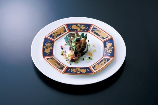 “感謝の一皿”花切り鮑の煎り焼き キャビア添え シャンパンと香味野菜のアンコールペッパー風味