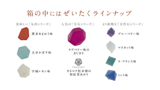 左上にティーバッグのお茶、右上が九州の味、右下が麗しい宝石ルビー、そして左下が天然石に寄せた蛍石の琥珀糖が入る