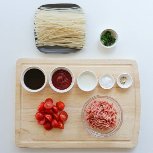 4.ゆでたライスパスタを器に盛り、ミートソースをかけ、パセリをトッピングする。