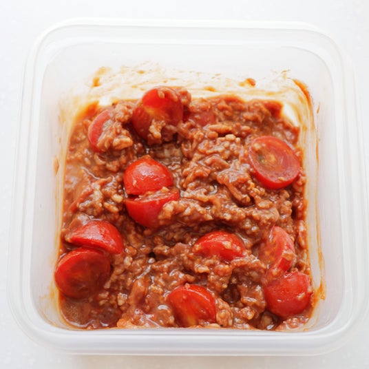 3.写真のように、耐熱容器に合いびき肉とミニトマト・【調味料A】の材料を加えて良く混ぜる。