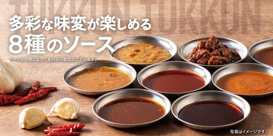 店内には多彩な味覚が楽しめる“8種のソースバー”を設置。8種のソースに加え、+αの激辛唐辛子たれもご用意しております。