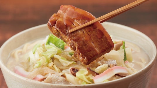 角煮まんじゅうの“岩崎本舗″と、ちゃんぽん・皿うどんの名店、“みろくや″のコラボ商品。厳選の豚肉を秘伝のタレで6日間かけて仕上げた「大とろ角煮」を豚骨ベースの味わい深い「みろくやのちゃんぽん」にトッピングしております。