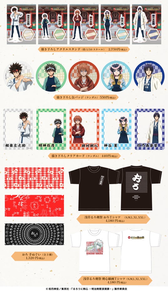 ドルチェフェスタ浅草では、コラボメニューの提供(ノベルティプレゼント付き)の他、期間限定グッズの販売、描き下ろしのキャラクター等身大パネルや神谷道場のジオラマ、逆刃刀と斬馬刀のレプリカを展示しています。
