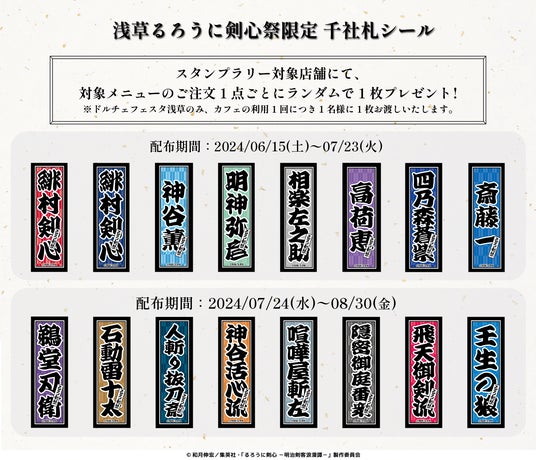 浅草オレンジ通りでカフェ「ドルチェフェスタ浅草」を運営する株式会社DOLCE FESTA(東京都台東区浅草1-16-11孔雀堂ビル 代表取締役:辻村 勲)では、2024年10月からのアニメ第2期放送開始を記念して、「るろうに剣心 ー明治剣客浪漫譚ー」×ドルチェフェスタ浅草のコラボレーションイベント「浅草るろうに剣心祭」を2024年6月15日(土)から8月30日(金)まで開催しています。