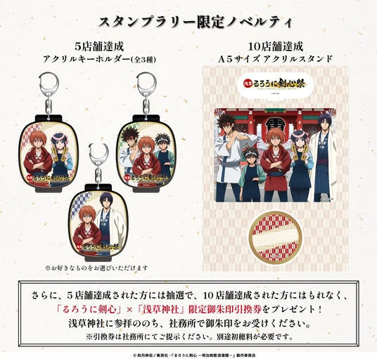 さらに浅草神社初、アニメとのコラボレーションを実現。開催期間中、スタンプラリー5店舗達成された方の中から抽選で、10店舗達成の方は全員に「るろうに剣心×浅草神社限定 御朱印引換券」をプレゼントいたします。