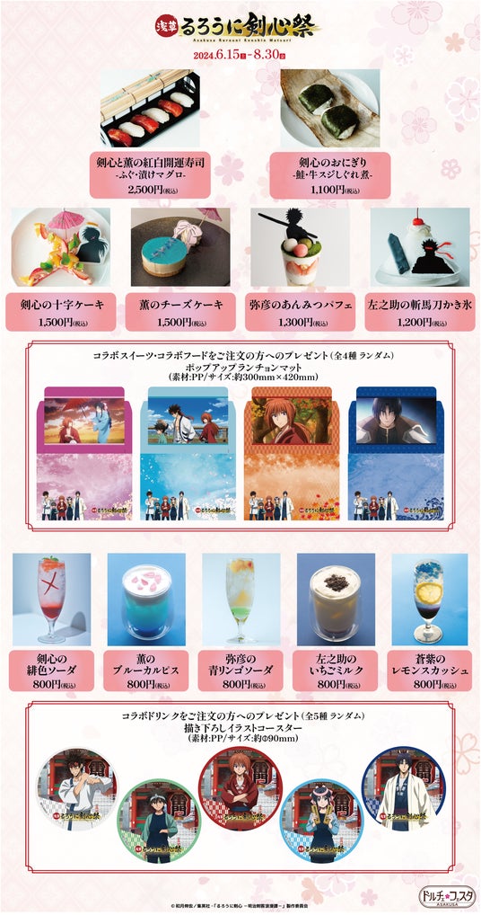 アニメ作品中に登場するキャラクター、緋村剣心、神谷薫、明神弥彦、相楽左之助、四乃森蒼紫をイメージしたフード、スイーツ、ドリンクを提供しています。