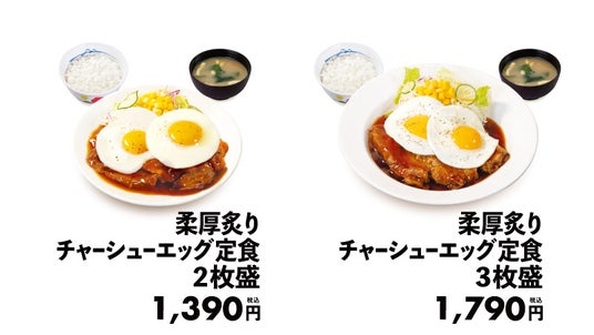 肉厚大判チャーシューに甘めのタレを絡め、目玉焼きを2つ乗せた、松屋得意のご飯泥棒メニューが新登場します。「チャーシューエッグ定食」は、炙りによって香ばしさが引き立つホロホロのチャーシューに、甘いタレが特徴的な、食べ応え満点の逸品。2枚盛、3枚盛をお選びいただけます。この機会にぜひ、ご賞味ください。