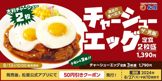 このたび松屋フーズ(本社:東京都武蔵野市、代表取締役社長:瓦葺一利)では、牛めし・カレー・定食・その他丼の「松屋」におきまして、2024年8月13日(火)10時より「柔厚炙りチャーシューエッグ定食」を販売いたします。
