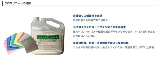 クロス(壁紙)を張り替えせずに、専用染色コート剤(抗菌・消臭・脱臭効果)をクロス全体に特殊刷毛にてコーティングし再生する工法です。工業機械をしないので施工中の騒音もなく隣近所に気を遣わず施工できるのが特徴です。クロスの張り替えだと、ただ壁が綺麗になるだけですが、クロスリコートの最大のメリットは施工費は張り替えより安価で、施工時間はおよそ3分の1で出来ることです。また、刺激臭もなく有害なVOC(揮発性有機物質)を含まない安全なもので、アトピーを診察する病院のクロスや保育園等の公共施設でも使用されている画期的な技術です。染色加工したクロスだとお部屋の嫌な臭いも24時間消臭効果が持続します。常にお部屋の中がクリーンルームに変身する特性を持つ次世代のクロス再生工法です。