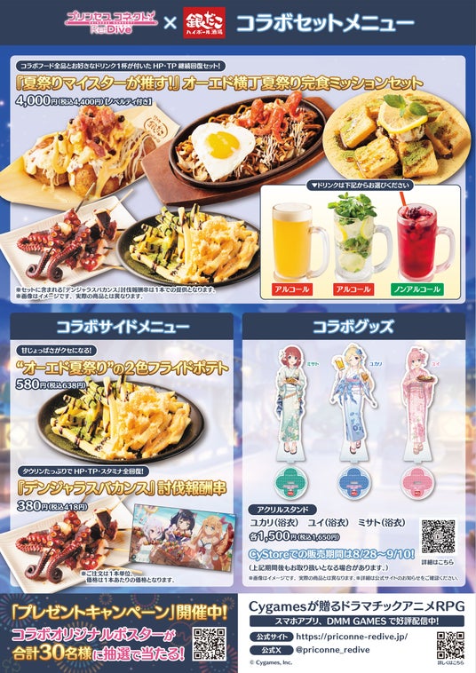 築地銀だこ https://www.gindaco.com/ を国内外に展開する株式会社ホットランド https://www.hotland.co.jp/ の子会社で、銀だこハイボール酒場・日本再生酒場・おでん屋たけしなどを展開する株式会社オールウェイズ https://alwayssaisei.co.jp/ は、昨年に引き続き、2024年8月14日(水)から9月10日(火)までの期間、全国の銀だこハイボール酒場(一部店舗を除く、62店舗)にて、株式会社Cygames https://www.cygames.co.jp/ が開発・運営するスマートフォン向けゲーム、アニメRPG 『プリンセスコネクト!Re:Dive(以下、プリコネR)』 とのコラボレーションを実施いたします!