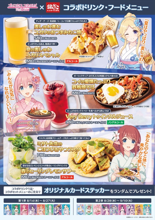 なお、コラボ期間中にコラボドリンク1杯およびセットメニュー1セットをご注文された方には、銀だこハイボール酒場コラボオリジナルカードステッカーを1枚プレゼント!当ステッカーは、過去にゲーム内に登場したサマーバージョンのキャラたちの他、今回のコラボのために描き下ろしされたユカリ、ユイ、ミサトのイラストを含めた全17種の中からランダムでお渡しいたします。