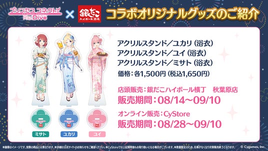 さらに!コラボ開催を記念して、オリジナル描き下ろしイラストを使用したコラボオリジナルグッズ(アクリルスタンド)も数量限定で発売します!店舗での販売は、銀だこハイボール横丁 秋葉原店のみ、オンラインでの販売はCyStore ( https://cystore.com/blogs/news/202408_gindaco ) にて販売予定です。CyStoreでの販売期間は第2弾開催中の8月28日(水)~ 9月10日(火)までとなっておりますので、ご注意ください。