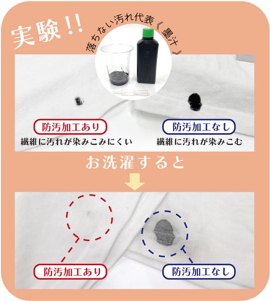 「防汚加工」とは、繊維に汚れが染み込みにくくするための加工のこと。もし汚れが付いてしまっても、汚れを弾くので生地自体に汚れが染み込みにくく、お洗濯で汚れが落ちやすい!