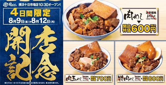 横浜市初出店となる「肉めし岡もと 横浜十日市場店」では、カツ丼でも牛丼でも親子丼でもない”新しい肉丼”を味わっていただけるよう、8月9日(金)~12日(月)の4日間限定、代表メニュー3品をとってもお得な開店特価で販売いたします。