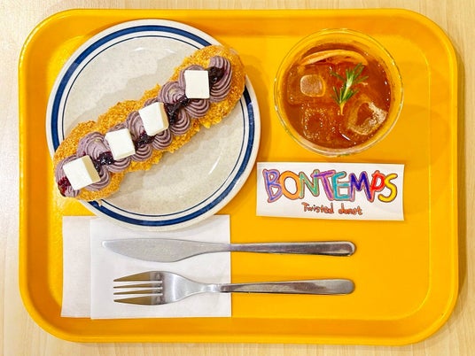 - ブルーベリーチーズ 580円(税込)チーズクランチをまとったドーナツに酸味とほどよい甘さを活かしながら仕上げたクリームは相性抜群!ブロック型のチーズケーキがアクセント。