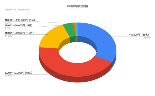 お酒の買取額は5,001円から10,000円の範囲が43.6%(48名)と、最も多くの方に該当しました。この範囲内の買取額が最も多いことから、比較的手頃な価格帯のお酒が多く取引されていることが伺えます。