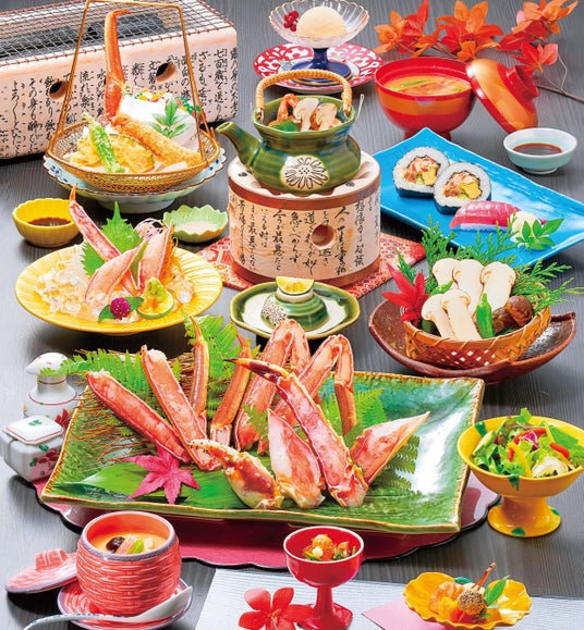 内容:かにと松茸の釜めし、ずわい半身盛り、松茸土瓶蒸し、かに刺身、かに天ぷら、寄せ豆冨、サラダ、お椀、香の物、デザート