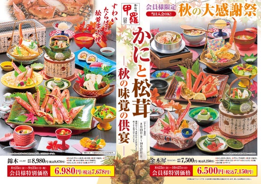 株式会社甲羅(本社:愛知県豊橋市、代表取締役社長:沼澤 裕)が全国で40店舗展開しているかに料理専門店「甲羅本店」では上質なかにと旬の季節食材を熟練の調理人が素材の魅力を最大限に引き出しお客様へ提供します。今回、秋の大感謝祭「かにと松茸フェア」を8月23日(金)~10月27日(日)の期間で開催します。※一部店舗を除く