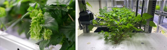 ホップはビール醸造に欠かせない原材料の一つであり、日本においては一般的に年に1回夏季に収穫されます。近年、気候変動、特に気温上昇や干ばつによるホップの収量・品質低下が問題となっており、品種改良や栽培技術の迅速な開発が求められています。屋外でのホップ栽培は、収穫と品質評価が年に1回しかできないため、品種改良には10年以上の長い期間が必要です。また、気候や病虫害の発生等の外部環境に生育が左右されやすいため、栽培技術の開発や評価を行うにも労力がかかります。一方、屋内栽培は人工的に制御した環境で、光・水・施肥等を最適に管理してホップを栽培することで、1年に複数回収穫と品質評価ができ、また外部環境の影響を受けず安定した栽培や評価が可能となるため、屋外栽培による研究開発の課題を解決できる可能性があります。