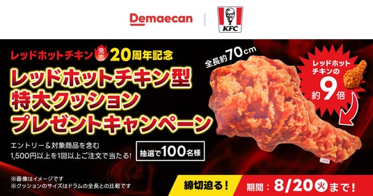 株式会社出前館は、運営する日本最大級のデリバリーサービス『出前館』において、ケンタッキーフライドチキン(運営:日本ケンタッキー・フライド・チキン株式会社、以下:KFC)とレッドホットチキン発売20周年を記念したキャンペーンを2024年8月20日(火)まで開催しております。 “レッドホットチキン型特大クッション”が当たるのは出前館だけ!この機会にぜひエントリー&ご注文いただき、KFCのレッドホットチキンをお楽しみください。