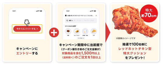 キャンペーン期間中に、キャンペーンページよりエントリーいただき、対象商品を含む1,500円以上(送料除く)の注文を1回以上していただいた方の中から抽選で100名様に「レッドホットチキン型の特大クッション」をプレゼントいたします。