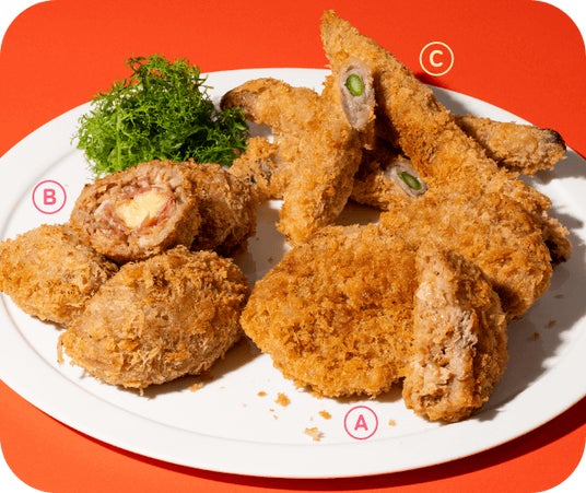 ▲Aメンチカツ 税込250円 / Bベーコンチーズメンチ 税込300円 / Cアスパラ巻き:税込250円