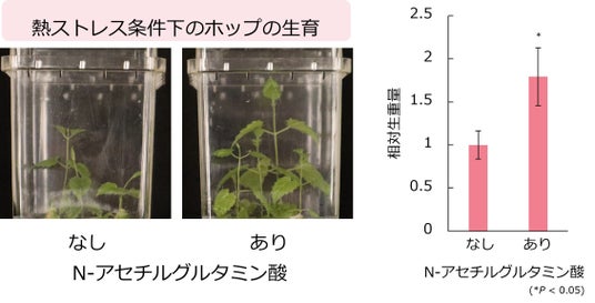 1)アミノ酸の一種であるN-アセチルグルタミン酸(NAG)がホップに対する熱ストレスを緩和することを明らかにしました。実験室内の試験において、熱ストレス条件下における植物体の生重量がNAG処理によって約1.5倍増加しました。