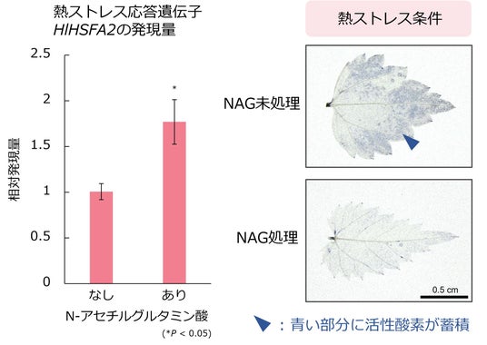 結果:HlHSFA2遺伝子の発現量を解析した結果、NAGを処理していないホップと比べてNAG処理されたホップではHlHSFA2の発現量が約2倍増加していました(左図)。さらに、熱ストレスによりホップでは活性酸素が蓄積しますが、NAG処理によって活性酸素の蓄積も抑制されていました(右図)。