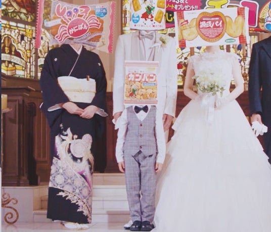 舞台は厳かな雰囲気の教会。結婚式の定番曲、メンデルスゾーン作曲「結婚行進曲」が流れる中、光が差し込む扉から登場したのはまさかの新婦の姿となった源氏パイ。そしてその横には燕尾服姿の新婦の父「チョコバット」。優しいまなざし?で見守るのは新婦の入場を待つタキシード姿の缶入りカンパン。ふと視線を移すとバージンロード脇に座る、涙をぬぐいながら見守っている留袖姿の新婦の母