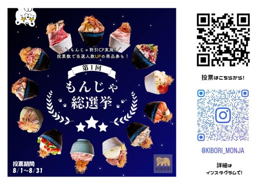 8月31日(土)まで『もんじゃ総選挙』も開催中!皆さまの投票で1位が決まります。人気投票で1位になったもんじゃは500円OFF(9/5~9/15の10日間)となり、投票された方には抽選で商品券をプレゼントいたします。