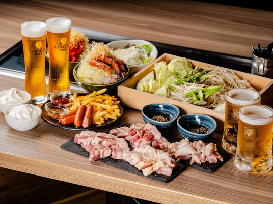 自慢のもんじゃとたっぷりお肉のBBQプランは約20種類のビア&ビアカクテルの飲み放題付きで絶賛ご予約受付中です。BEAR HALL(ベアホール)期間限定BBQ・もんじゃプランは4,500円(税込)からご用意しております。