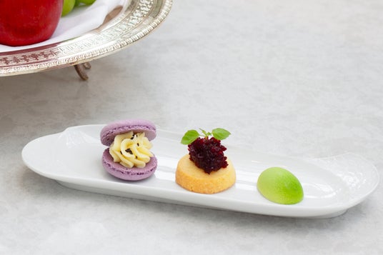 デザートコースならではのお口直しには、栗かぼちゃとさつまいもの自然の甘みを活かしたリゾットをご用意。求肥で優しく包み、仕上げにウィスキーオークのウッドチップで燻製し深く豊かな風味に。香りと食感で優しくリセットされた後には、ロビーラウンジで好評のパフェが食べやすいサイズで登場。エディブルフラワーだけでなく果実や和栗のクリームで花開いた秋のお花畑に、蝶が舞う麗しい一品です。さらに最後の一口までおいしくいただけるようにと、プティフル3種にもぎっしりとこだわりと旬を詰め込みました。