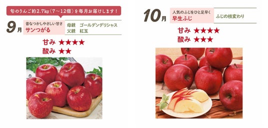 青森の短い夏が終わると、りんごの季節が到来します。青森県の最高峰「岩木山」の麓にあり昼夜の寒暖差が大きな相馬村で育つりんごは着色がよく、甘みも強くなります。そんな相馬村自慢のりんごの中から食べごろを迎えるスター品種を寄りすぐり、できるだけ獲れたての新鮮さをキープして毎月お届けするコースです。