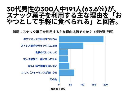 30代男性の300人を対象とした「スナック菓子を利用する主な理由は何ですか?」というアンケートで191人(63.6%)が「おやつとして手軽に食べられる」という結果になりました。