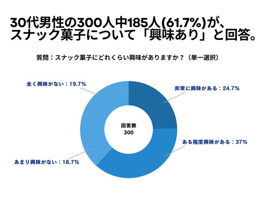 30代男性の300人を対象とした「スナック菓子にどれくらい興味がありますか?」というアンケートで185人(61.7%)が「スナック菓子について興味あり」という結果になりました。