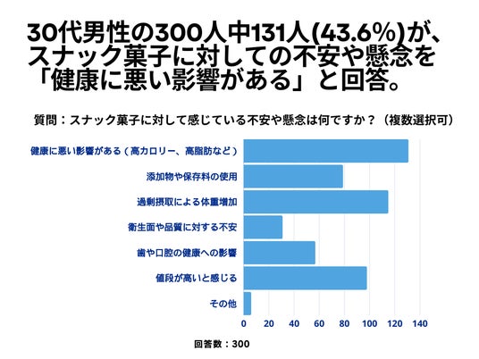 30代男性の300人を対象とした「スナック菓子に対して感じている不安や懸念は何ですか?」というアンケートで131人(43.6%)が「健康に悪い影響がある(高カロリー、高脂肪など)」という結果になりました。