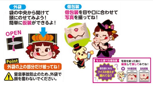 ・キャンディを食べた後の個包装を手に持って友達やペットの顔をのぞくと仮装しているように見える仕掛け付き