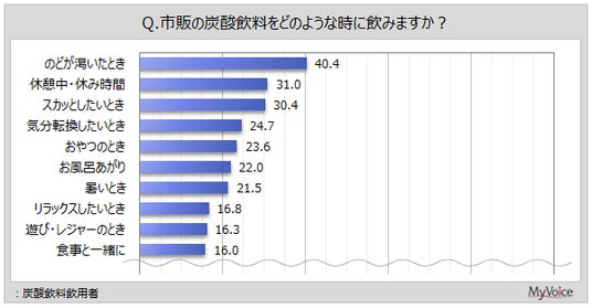 炭酸飲料飲用者に、どのような時に炭酸飲料を飲むかを聞いたところは(複数回答)、「のどが渇いたとき」が40.4%、「休憩中・休み時間」が31.0%、「スカッとしたいとき」が30.4%です。